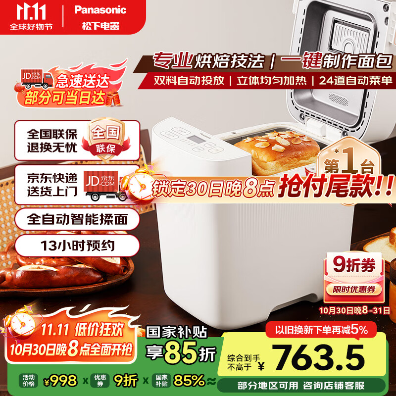 松下(Panasonic)【国家补贴】家用面包机 可预约 全自动智能揉面多功能 断电记忆保护 自制面包机SD-PD100