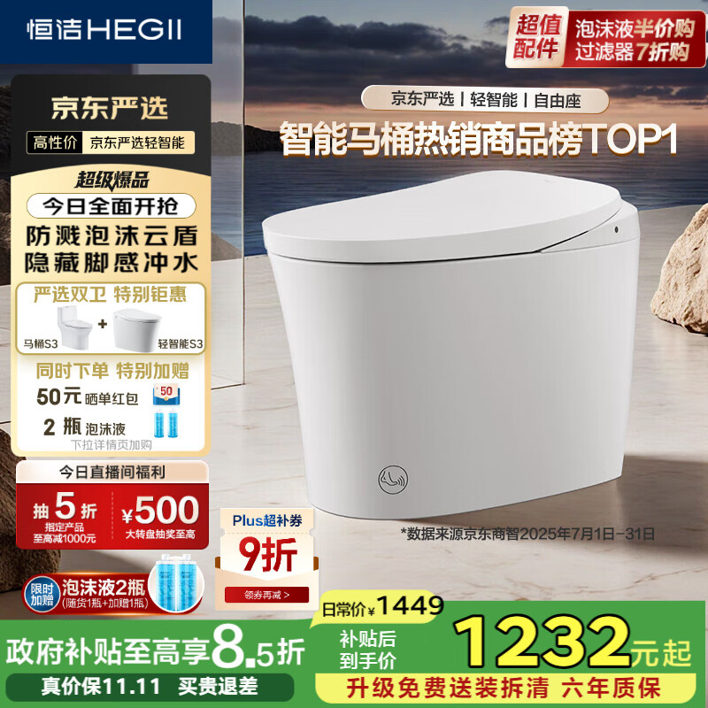 恒洁(HEGII)京东联名金榜轻智能马桶S3 泡沫盾脚感冲无水压限制DCQ661A-305mm