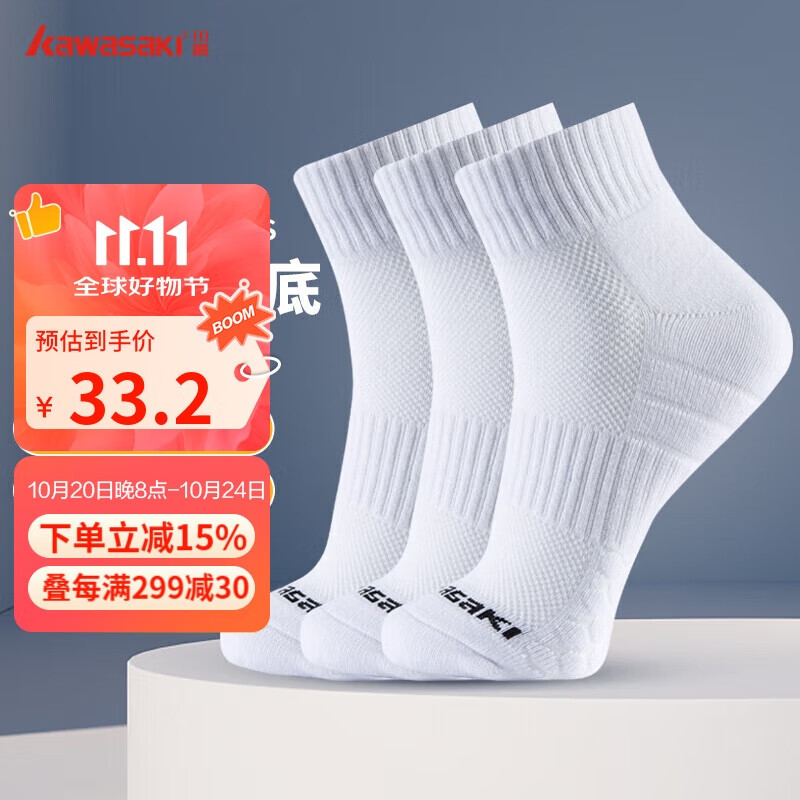 kawasaki川崎羽毛球袜袜子男毛巾底运动短袜6323(三双装) 白色 均码