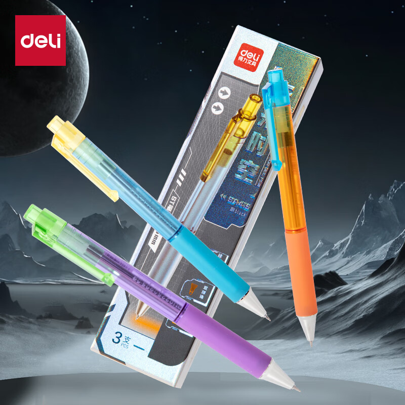 得力(deli)赛博朋克按动中性笔 低重心设计 0.5mm双球珠ST头速干学生中性笔刷题笔考试笔 黑色3支/盒SA415