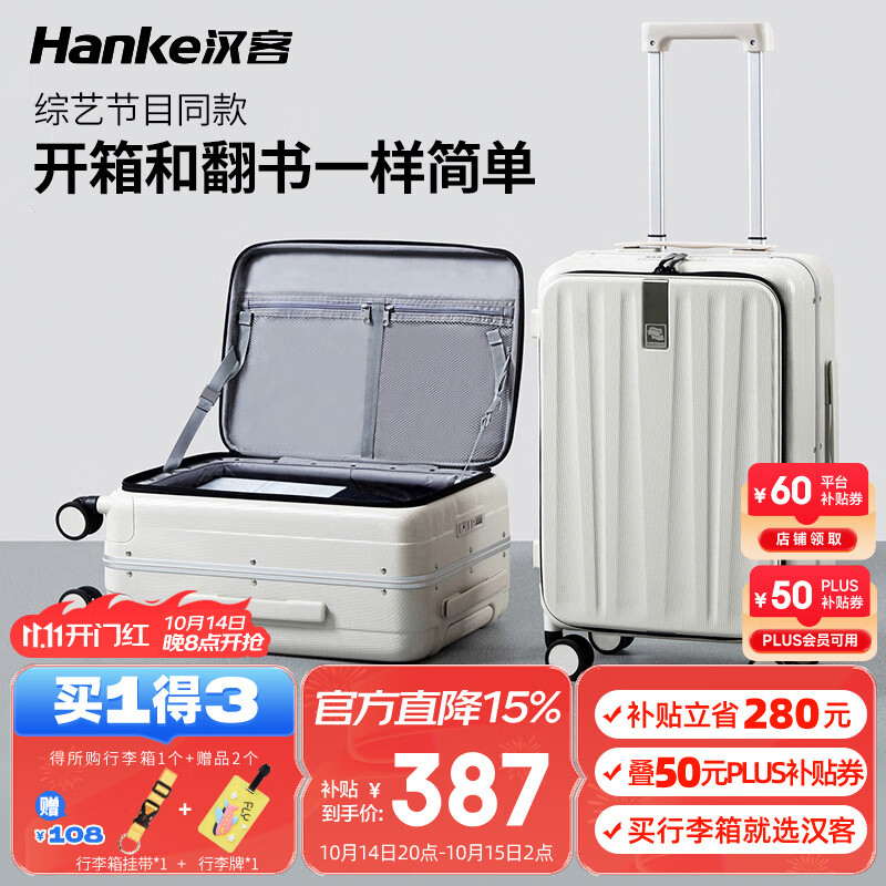 汉客行李箱男拉杆箱女登机旅行箱20英寸象牙白密码箱镇店前侧开盖铝框