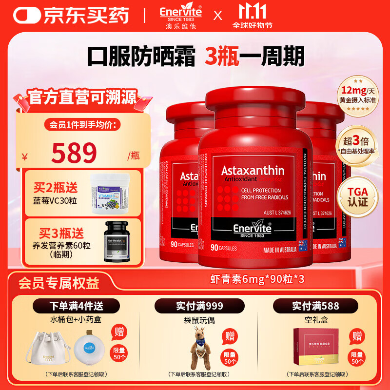 EnerVite虾青素胶囊口服天然雨生红球藻虾青素抗氧化自由基营养备孕 6mg*90粒*3瓶