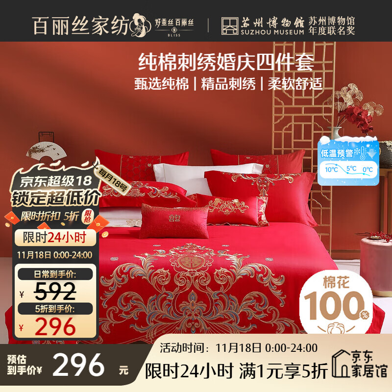 百丽丝水星家纺出品结婚四件套婚庆纯棉刺绣婚房结婚套件大红色床单被套