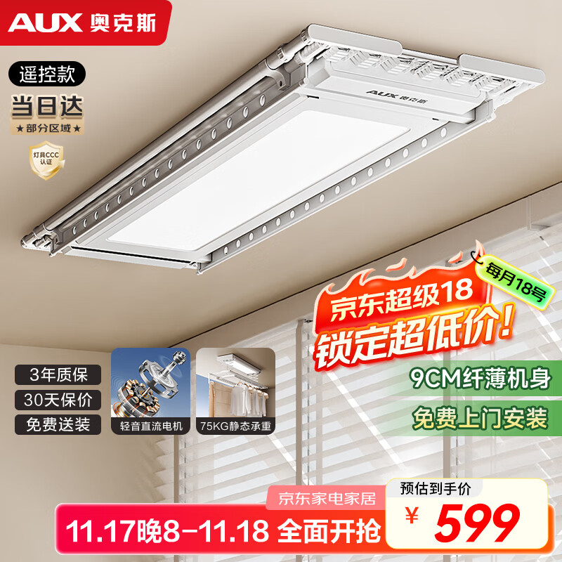 奥克斯(AUX)电动晾衣架智能晾衣机全自动升降杆遥控阳台超薄隐藏嵌入式晒衣机