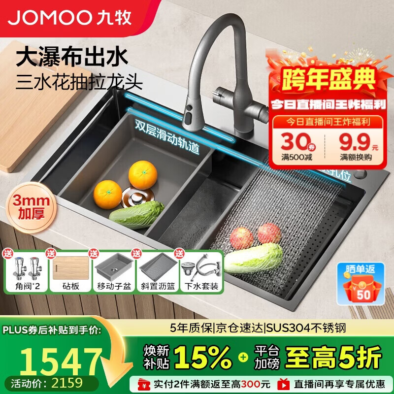 九牧(JOMOO)不锈钢魔法师厨房水槽大单槽洗菜盆飞雨瀑布槽78*48抽拉龙头06388