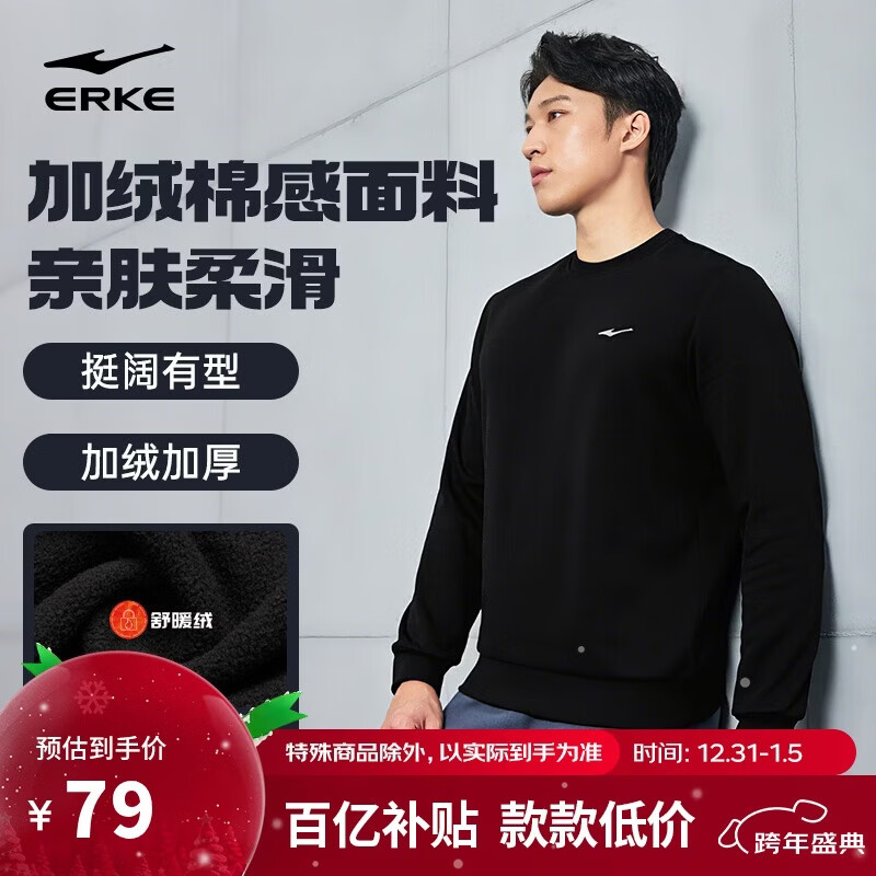 鸿星尔克卫衣男秋冬加绒长袖休闲套头衫打底运动跑步服简约纯色男士上衣