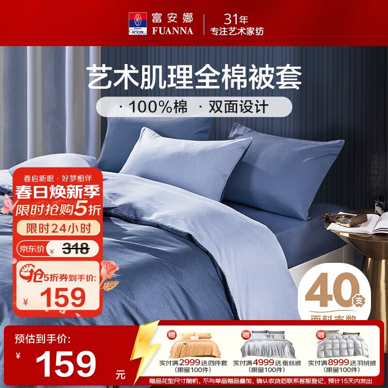 富安娜家纺 纯棉被套单件全棉被罩双人加大 1米8床(230*229cm)极简