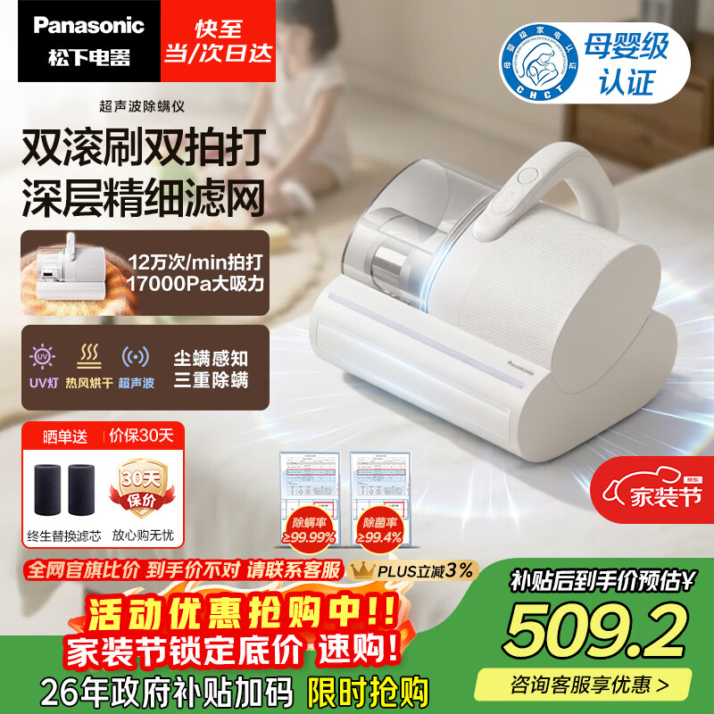 松下(Panasonic)【清洁神器】超声波除螨仪母婴级床宝家用床上吸尘器大吸力紫外线杀菌热烘除湿双滚刷双杯MC-DC25W