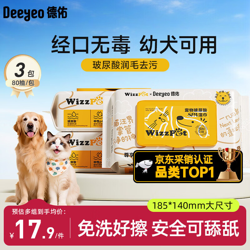 德佑宠物湿巾80抽*3包 免洗除臭湿纸巾EDI纯水猫狗通用无毒可舔舐