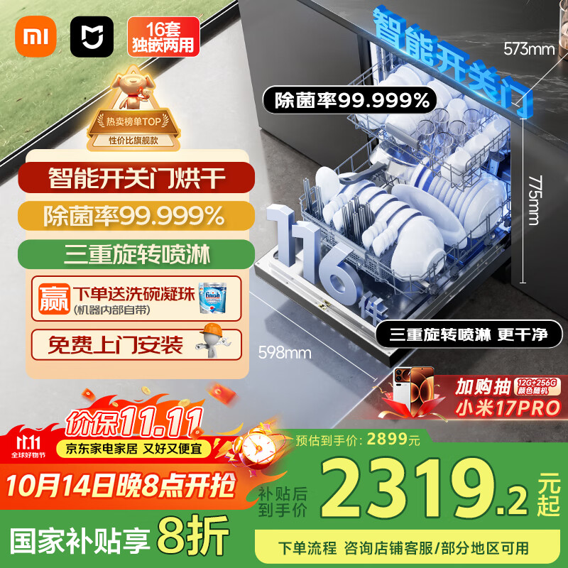 米家小米洗碗机16套N1【智能开关门烘干】大容量嵌入式独立式独嵌两用一级水效QMDW1602M