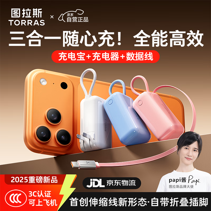 图拉斯充电宝【三合一随心充】3C认证可上飞机10000毫安苹果17移动电源35W充电器自带折叠插头伸缩数据线
