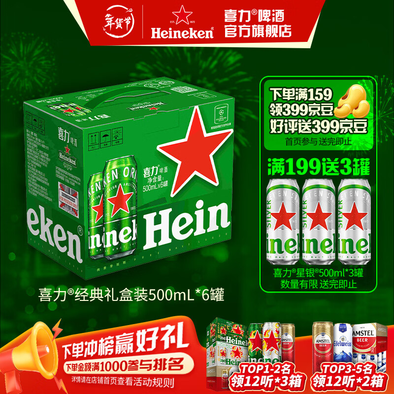 喜力啤酒 经典整箱礼盒装 全麦酿造 原麦汁浓度≥11.4°P 500mL 6罐