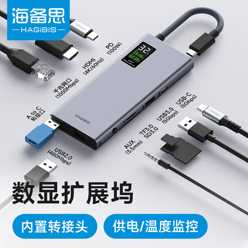 海备思(Hagibis)数显拓展坞带屏扩展坞USB-C转换器网口转接头Type-C转HDMI适用苹果电脑Mac雷电4转接器