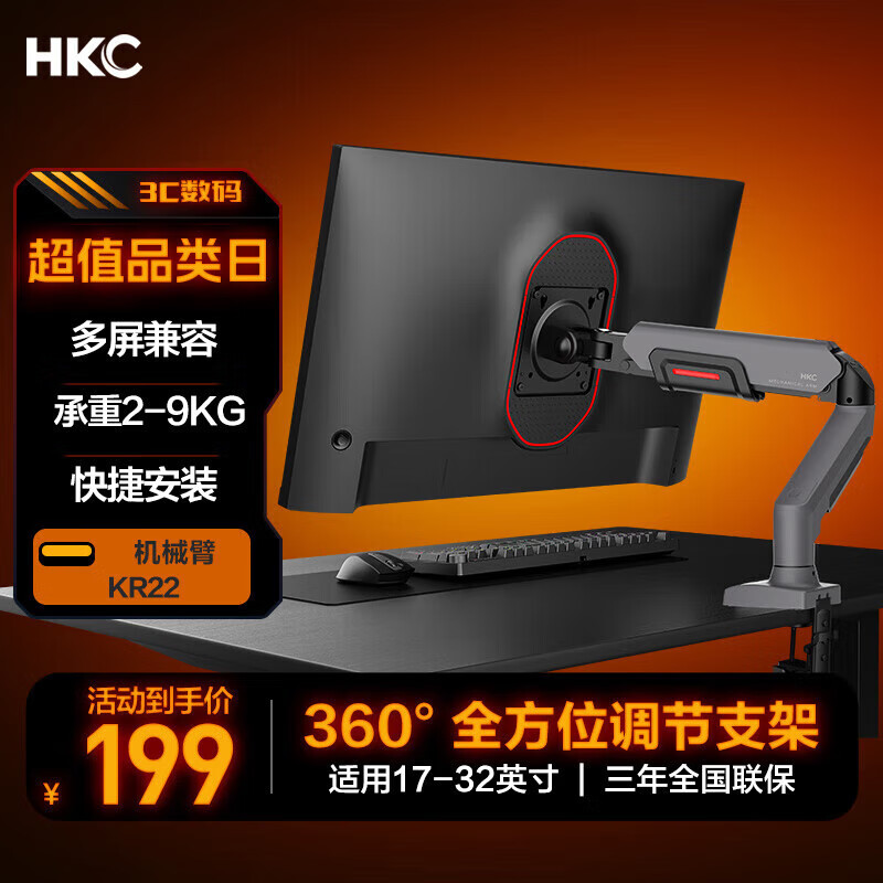 HKC 显示器支架显示屏幕机械臂电脑桌旋转升降居家办公灰黑色承重9KG增高架免打孔75mm100mm KR22
