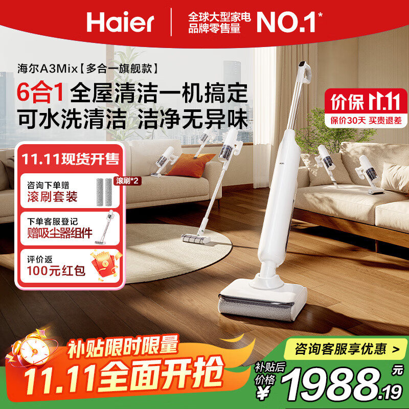 海尔(Haier)可水洗洗地机A3Mix【1机6用 22000Pa大吸力 平躺防缠 热水洗】洗拖吸一体自动清洗拖地机 国家补贴