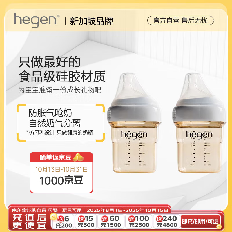 HEGEN海格恩奶瓶ppsu宽口径硅胶奶嘴耐摔防胀气150ml奶瓶双支(1-3个月)