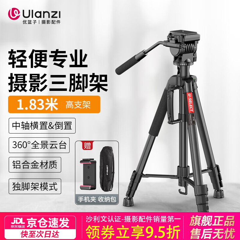 优篮子【Ulanzi】VT02铝合金三脚架全景液压云台微单反相机手机直播便携拍照摄影摄像vlog户外旅行支架 【爆款】VT-02(赠冷靴手机夹)