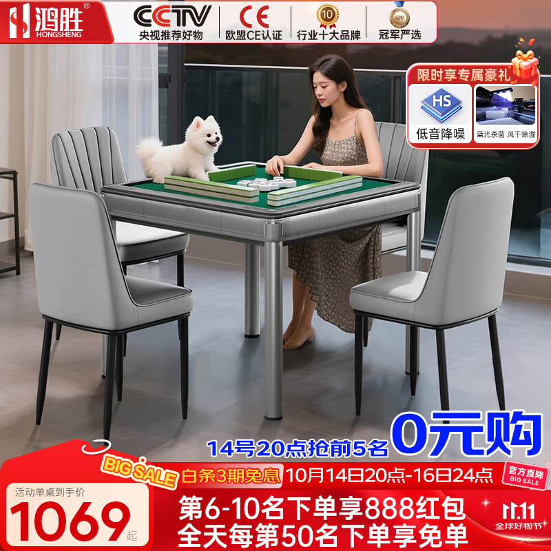 鸿胜【十万次0故障+180天换新】麻将机全自动餐麻将桌家两用低音电动 01【冠军严选】低音带盖板-星空灰