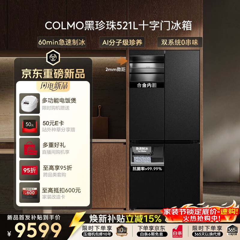 COLMO黑珍珠521L十字门冰箱自动制冰纯平全嵌一级能效双系统风冷无霜以旧换新星石黑CRBUS521-C3