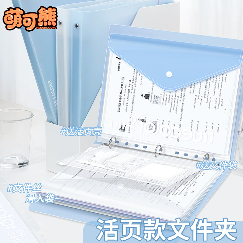 萌可熊A4活页文件夹资料册透明ins学生试卷收纳袋3孔可拆文件资料册档案夹办公收集册 海盐蓝