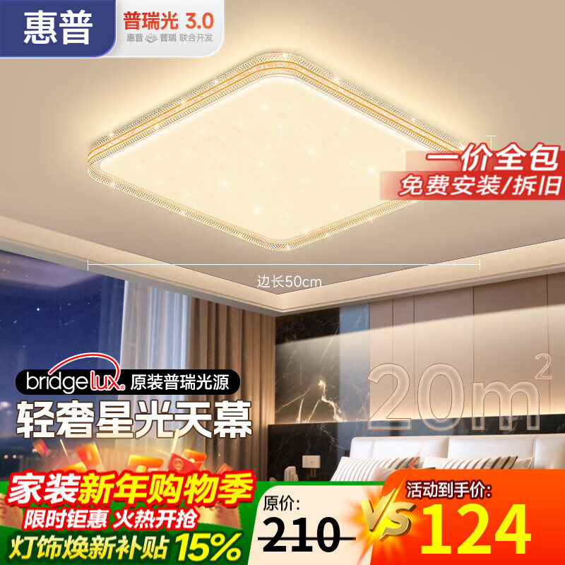 惠普客厅灯吸顶灯普瑞护眼LED照明大气轻奢风全屋灯具套餐中山包安装 60W 普瑞光源-方形50cm-三色