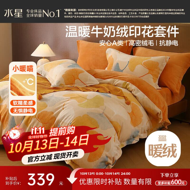 水星家纺牛奶绒四件套床上A类抗静电双面绒床单被套冬天保暖双人加大1.8m床叶梦然