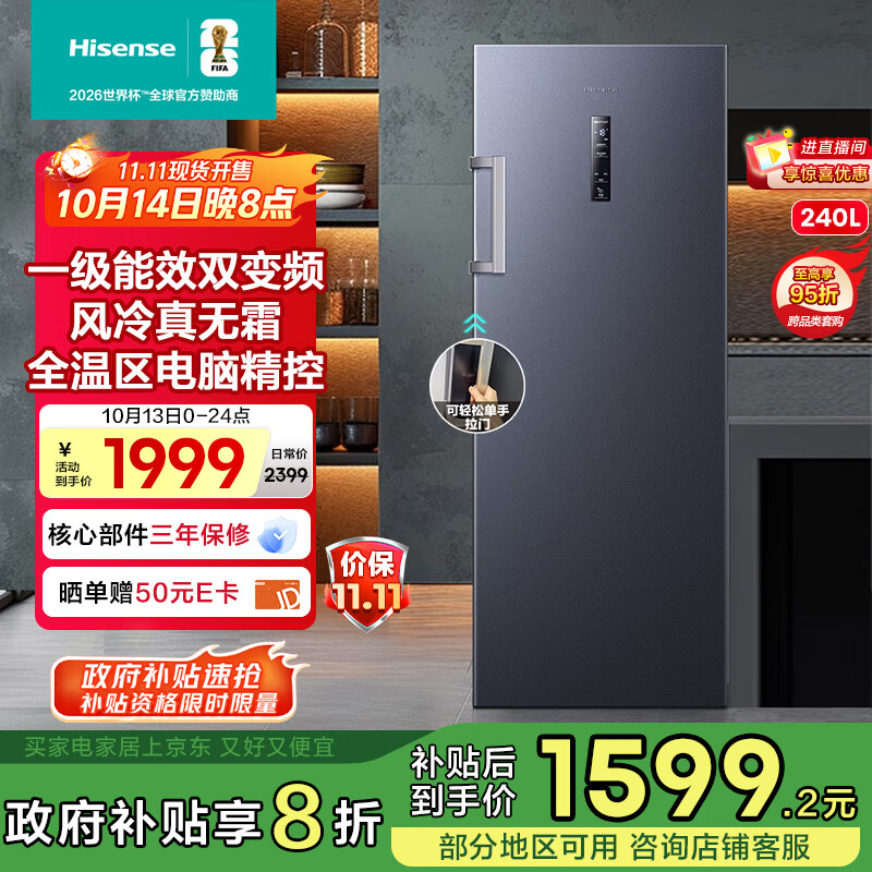 海信(Hisense)240升立式冰柜 变频一级能效风冷无霜冷柜 母婴母乳冷藏冷冻抽屉式单门冰箱BD-240WPVUT
