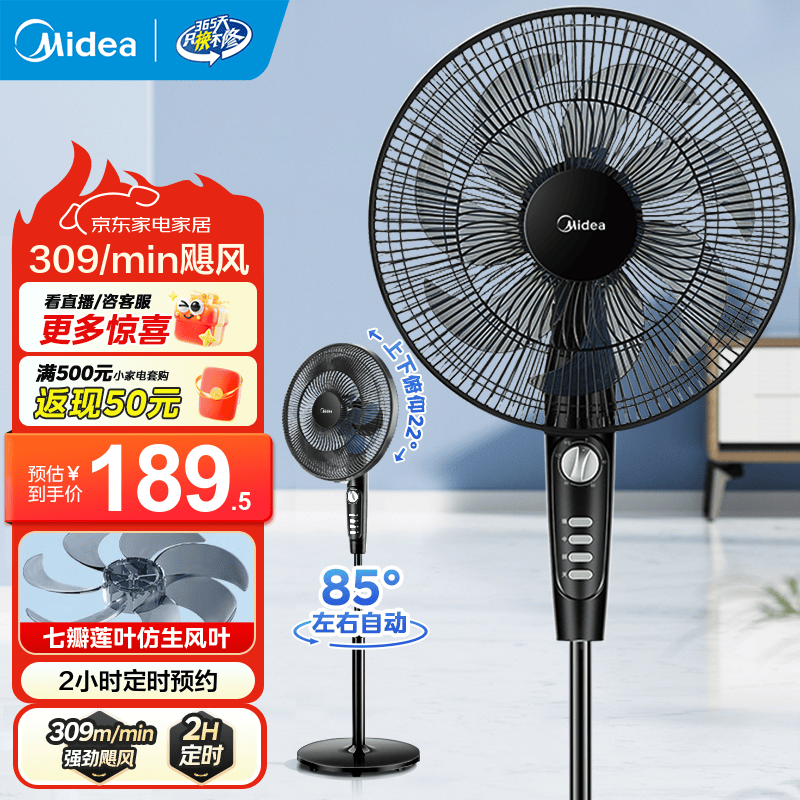 美的(Midea)电风扇家用风扇落地扇 7叶远距强风电扇立式轻音静音节能可定时降温黑色机械款 【风速309m/min】超级单品