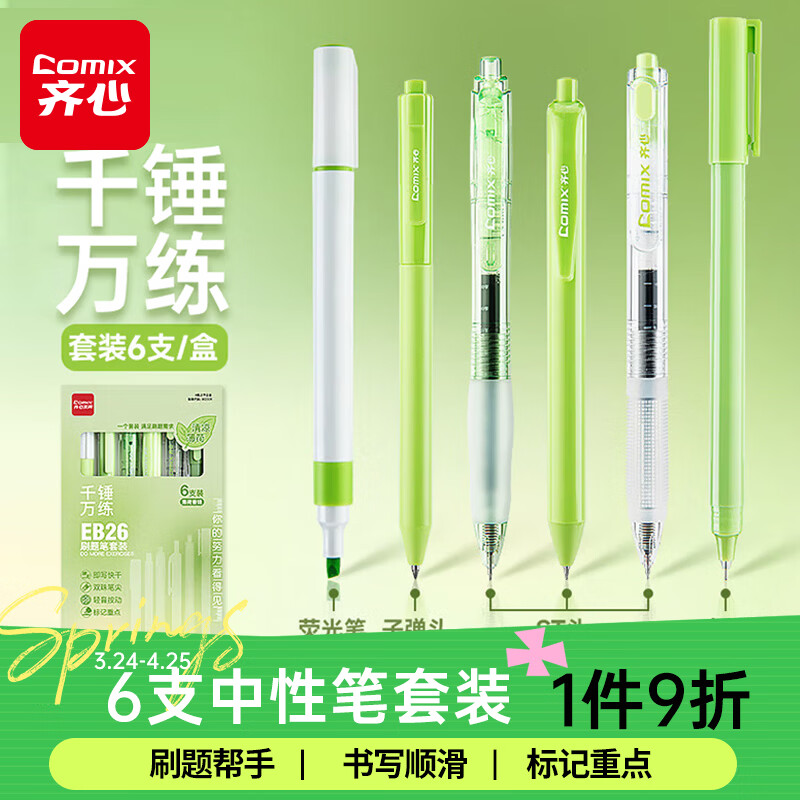 齐心(Comix)速干中性笔套装 千锤百炼高颜值荧光笔中性笔直液笔ST头学生刷题笔薄荷味 6支装EB26