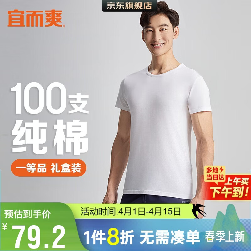 宜而爽【高档100支】100%纯棉男士T恤打底衫圆领短袖男送礼盒装
