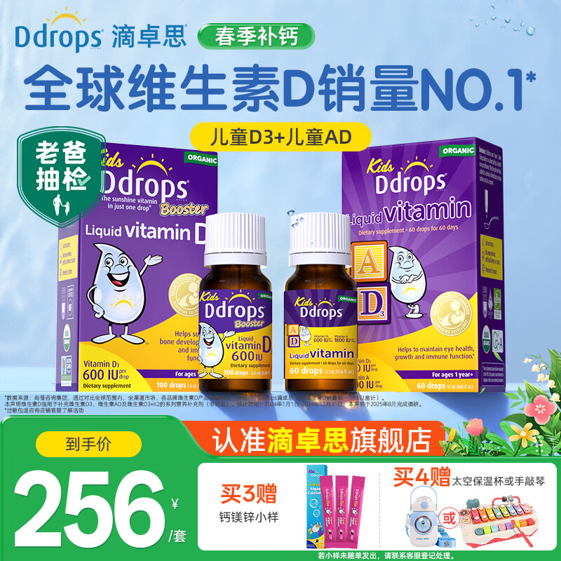 Ddrops滴卓思维生素D3滴剂促进钙吸收液体钙海藻钙镁锌补脑藻油DHA 【1岁-18岁】儿童AD+儿童D3/ 1瓶*1瓶