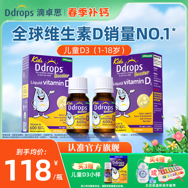 Ddrops滴卓思婴儿d3滴剂 维生素d3婴儿钙吸收 低敏d3 0-1岁 【1岁-18岁】儿童D3滴剂 2.8ml*2瓶