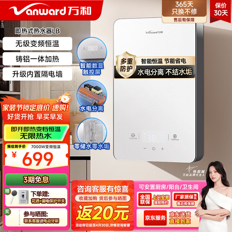 万和(Vanward)即热式电热水器淋浴家用速热防漏电免储水洗澡器小型集成洗澡机变频恒温卫浴加热器 7000W 【皓月银】水电分离