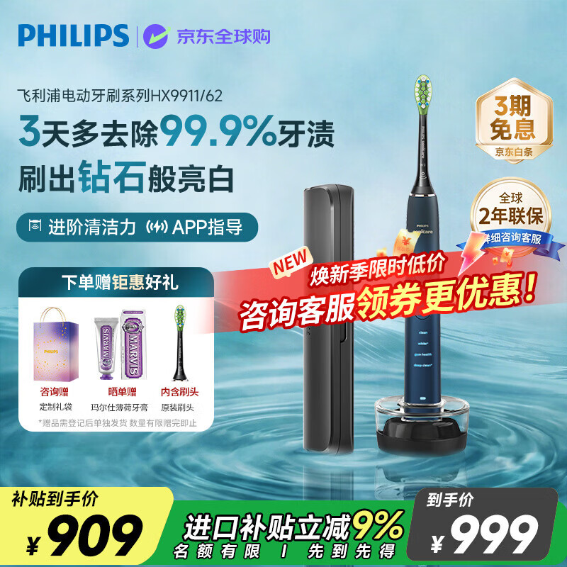 飞利浦(PHILIPS)电动牙刷高端钻石9系 智能升级款去除99.9%牙渍 生日礼物 情侣款送男生女友 HX9911/62水手蓝
