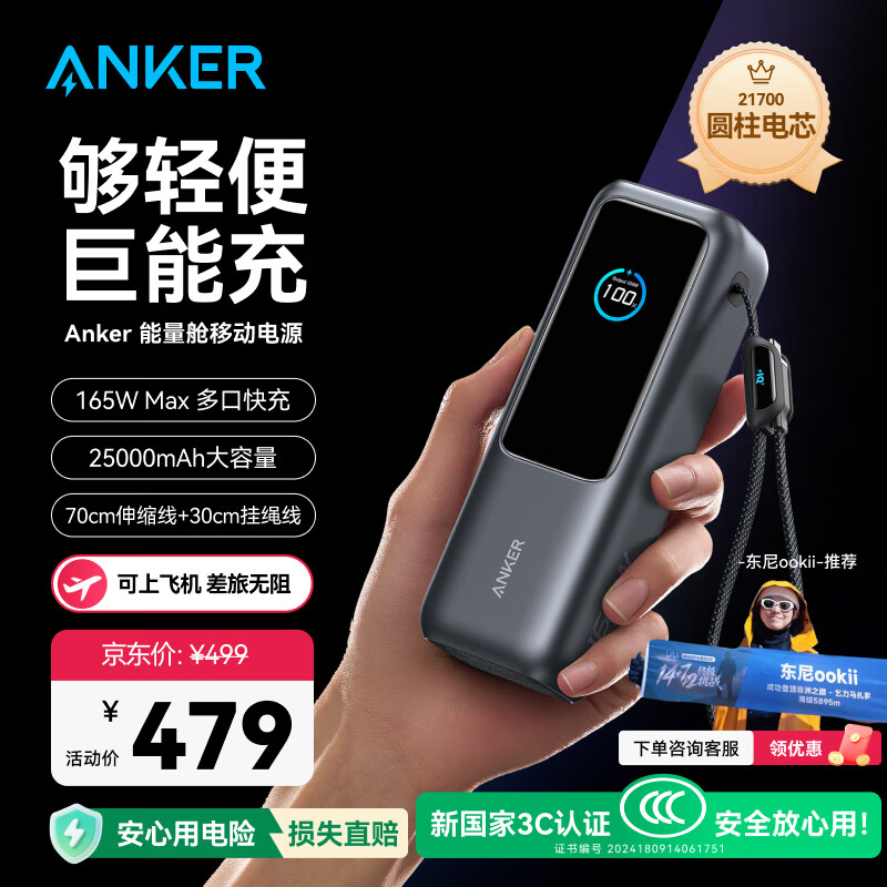 ANKER安克能量舱【新3C认证可上飞机】东尼ookii推荐165W充电宝超大容量自带伸缩线25000毫安苹果17锖