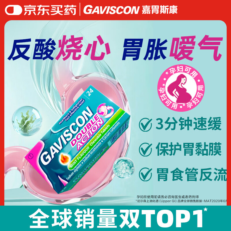 Gaviscon嘉胃斯康咀嚼片24粒 英国进口胃药胃食管反流性食管炎胃炎胃痛胃酸胃胀反酸烧心胃灼热消化不良藻酸盐不含铝