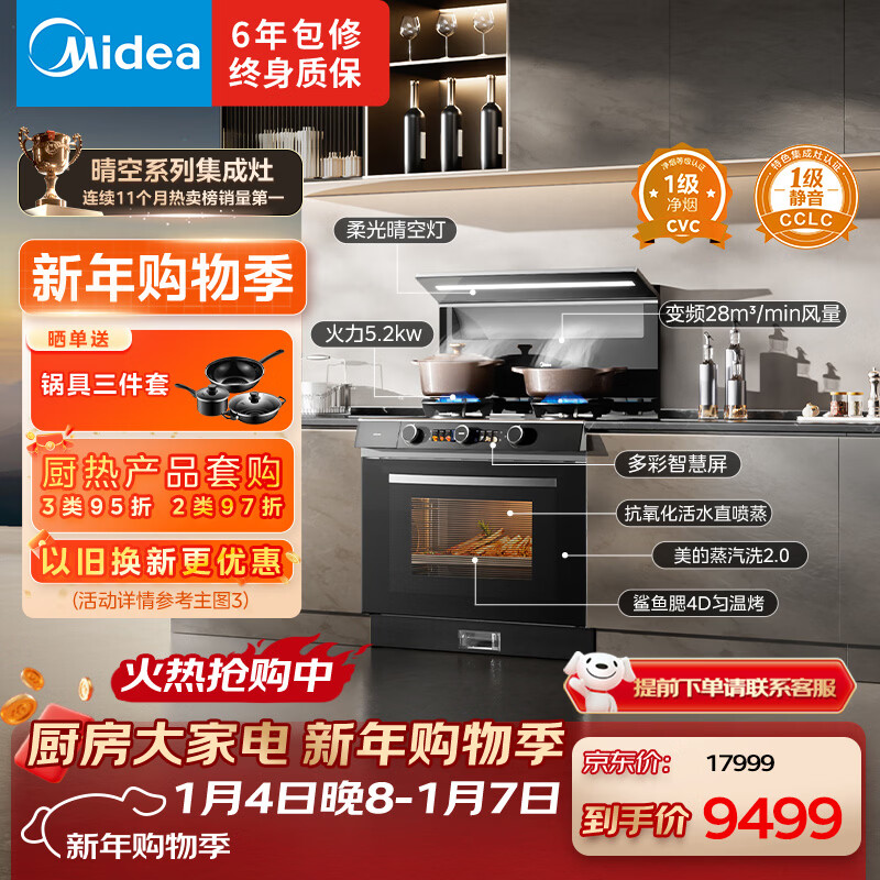 美的【晴空FX90PRO】集成灶一体式 变频28风量 蒸汽洗2.0 蒸烤炸一体 蒸汽洗自清洁 家用灶具