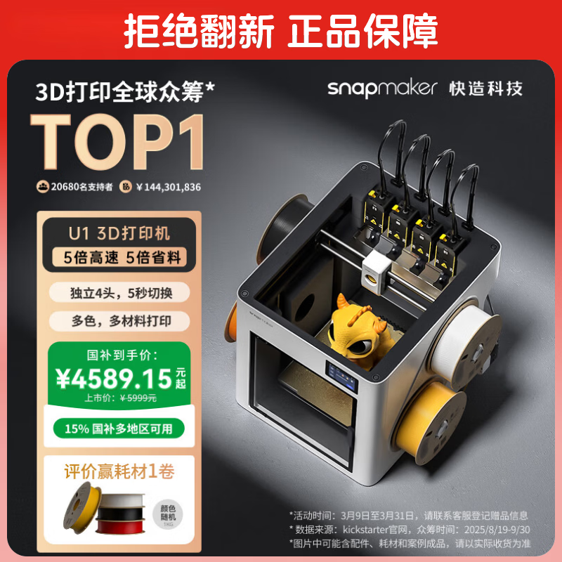 SNAPMAKER快造U1 3D打印机独立4喷头彩色多材料高精度大尺寸AI智能监测家用桌面高速打手板模型5倍省料