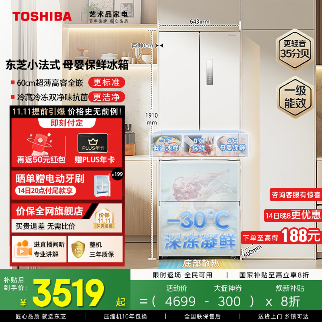 东芝(TOSHIBA)小法式420多门小户型60cm嵌入式四开门一级能效风冷无霜变频电冰箱家用国家补贴GR-RF420WI-PM171