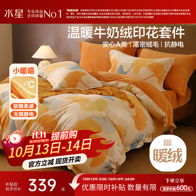 水星家纺牛奶绒四件套床上A类抗静电双面绒床单被套冬天保暖双人加大1.8m床叶梦然