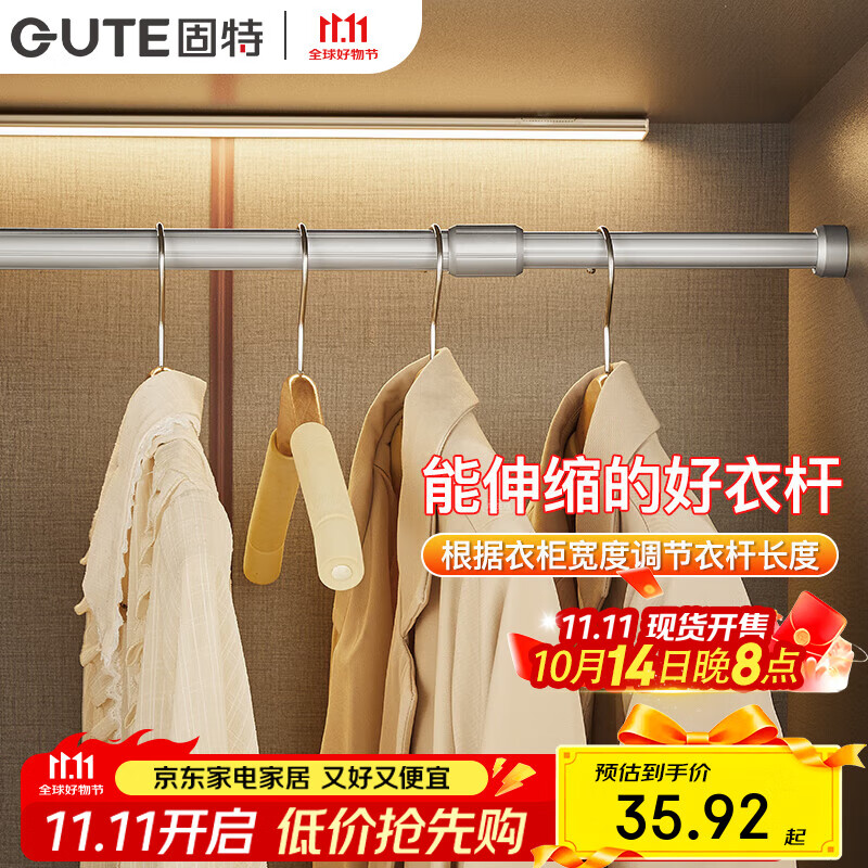 固特(GUTE)衣柜挂衣杆可伸缩橱柜杆衣柜杆固定杆衣架晾衣杆配底座银色中号