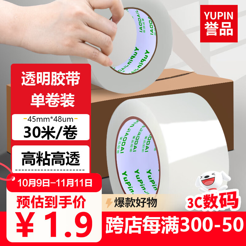 誉品(YUPIN)透明胶带封箱打包带高品质胶布封口胶纸办公用品批发 宽45mm*长30m(单卷30米)