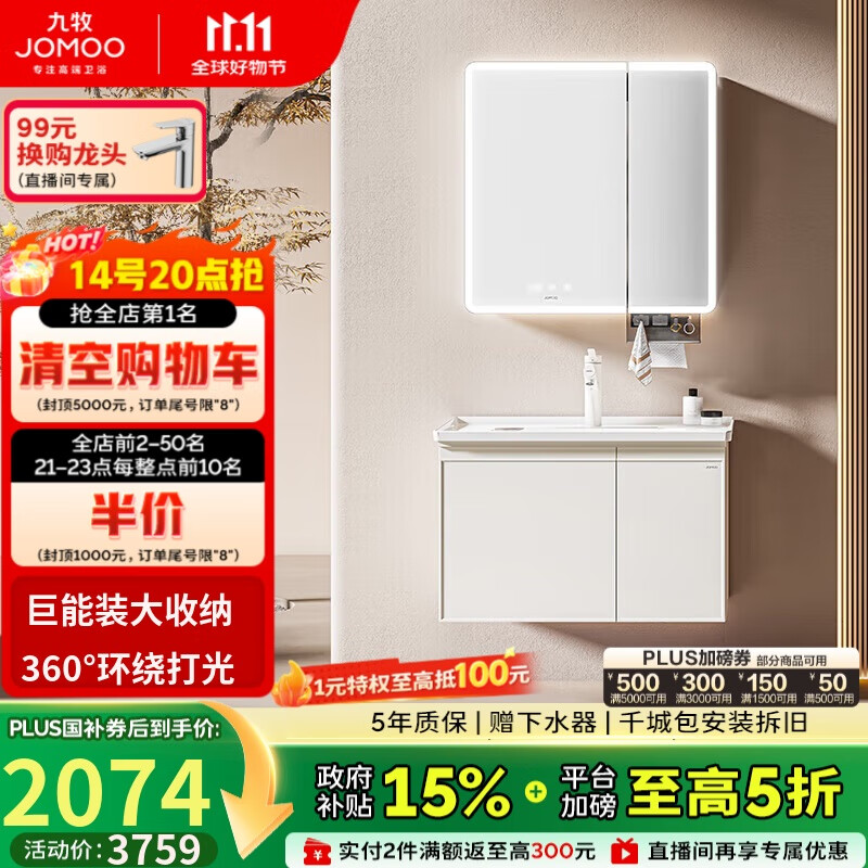 九牧(JOMOO)浴室柜巨能装陶瓷一体盆智能数显洗脸盆柜组合80cm A2770-14EX-Z1