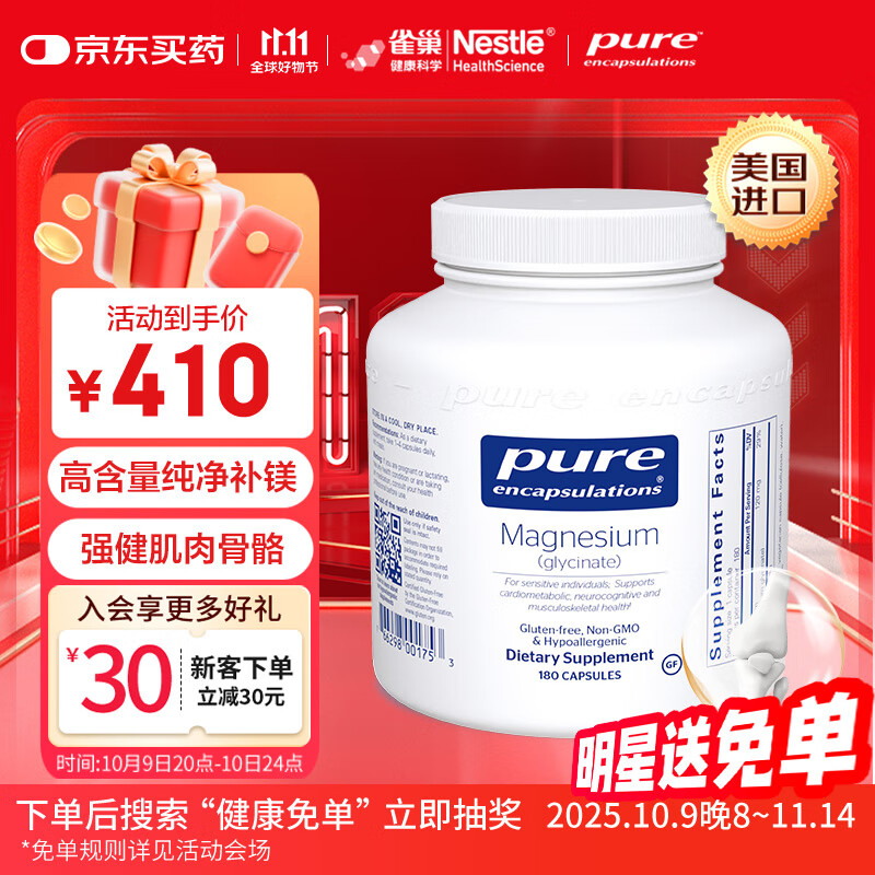 pure encapsulations雀巢倍宜高吸收补镁片强健关节肌肉肌肉成人 180粒/瓶 美国进口
