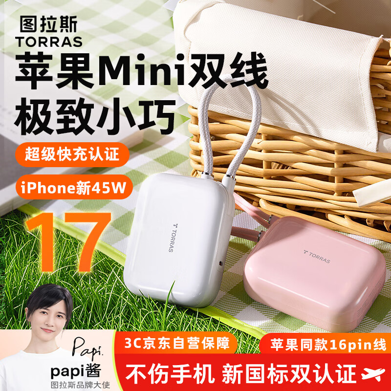 图拉斯【迷你|低温快充苹果17】充电宝3C认证可上飞机自带双线1万毫安45W小巧移动电源适用iphone华为白