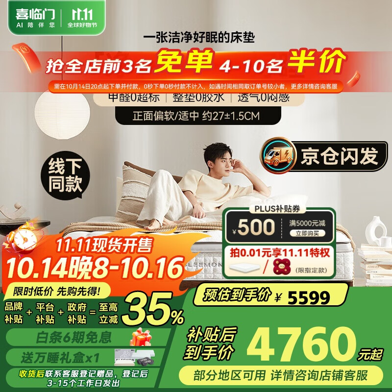 喜临门四叶草0胶袋装弹簧空气纤维床垫线下同款净眠M60 1.8x2米软硬适中