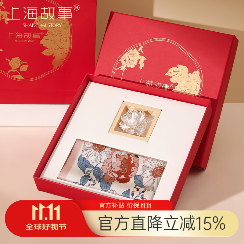 上海故事真丝丝巾胸针高档礼盒100%桑蚕丝小方巾送女友实用生日礼物红色