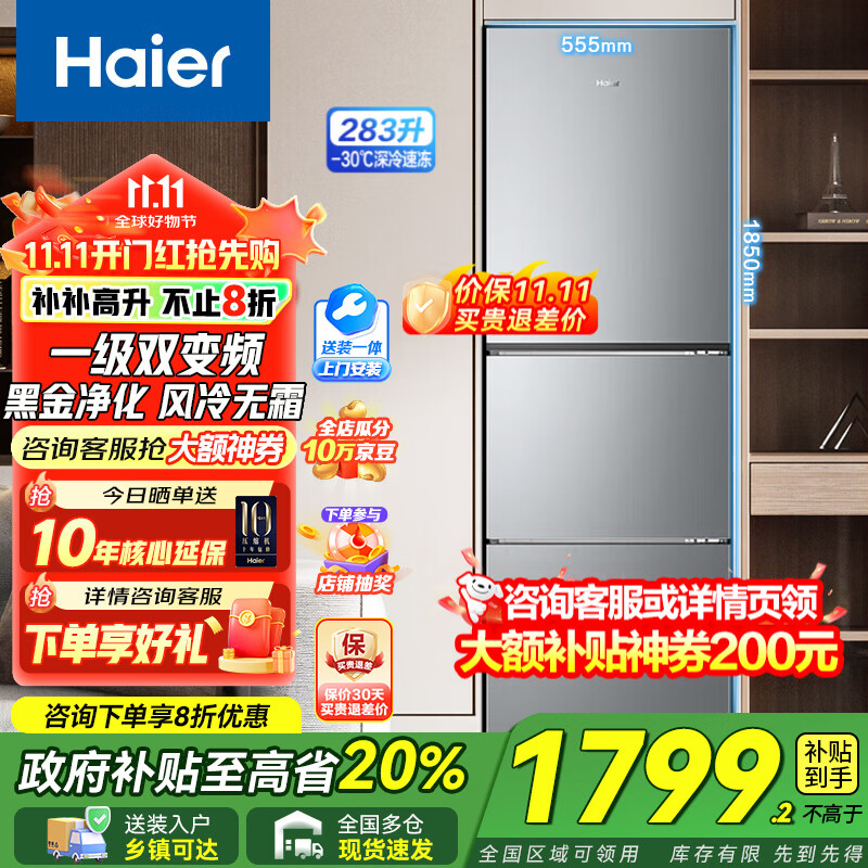 海尔冰箱三开门283升多门一级能效风冷无霜变频家用超薄节能电冰箱 以旧换新国家补贴20%【25年新品】 三门三温区+黑金净化+食品级安全材质+左右开门