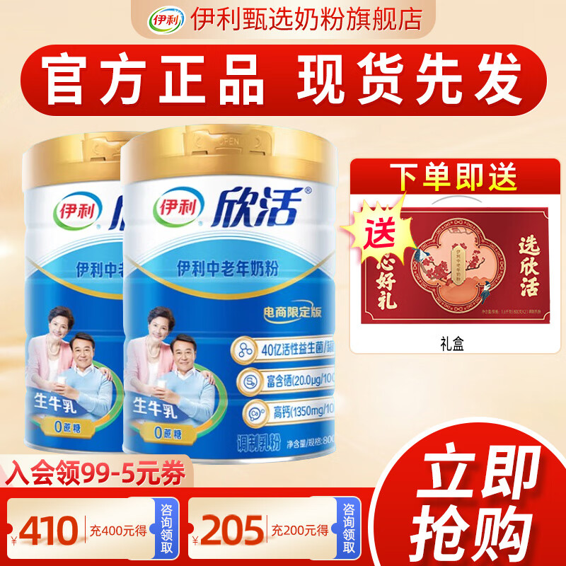 伊利欣活中老年奶粉800g 富硒多维高钙 0蔗糖 送长辈 2罐礼盒装