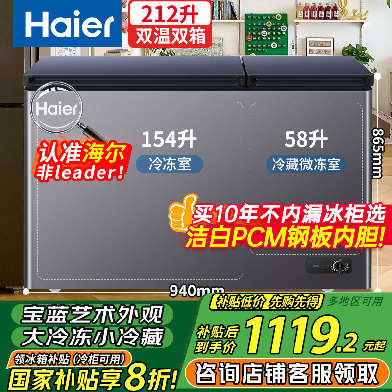 海尔(Haier)宝蓝冰柜212升家用冷藏冷冻两用保鲜双温双箱柜无需频繁除霜卧式小冰箱FCD-212GHXPCZ国家补贴20%